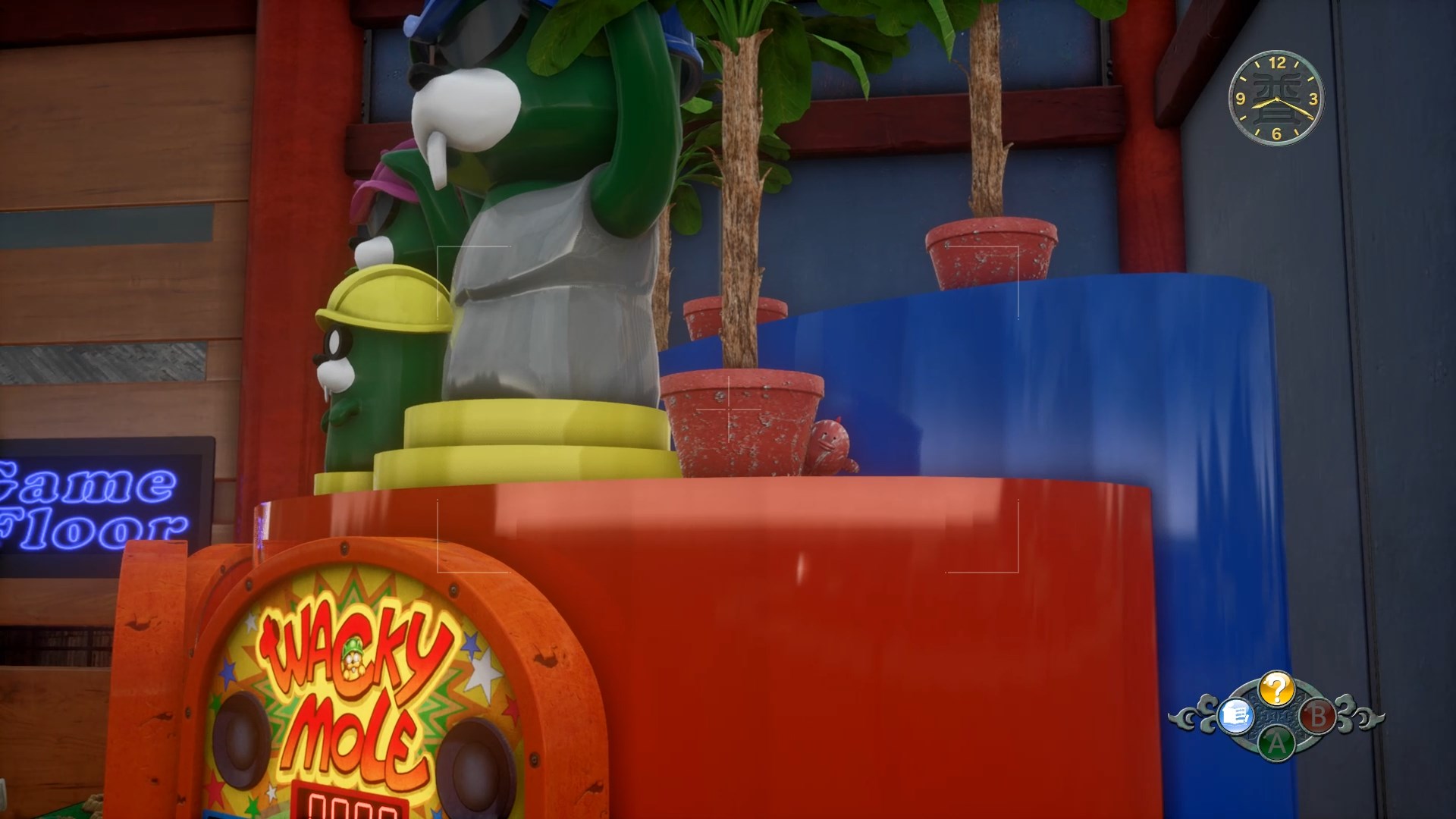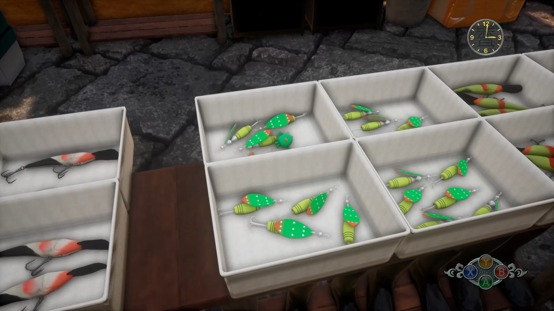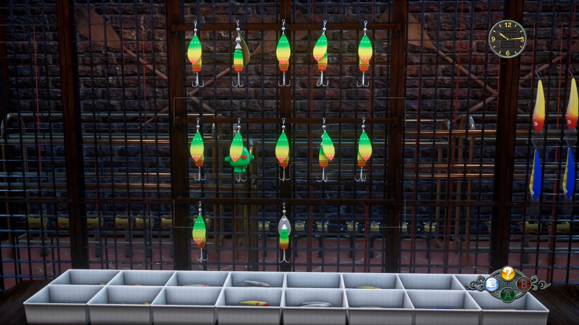| 巨大釣具 | 中央の棚に掛かっている緑・黄・赤のルアーに擬態 |  |